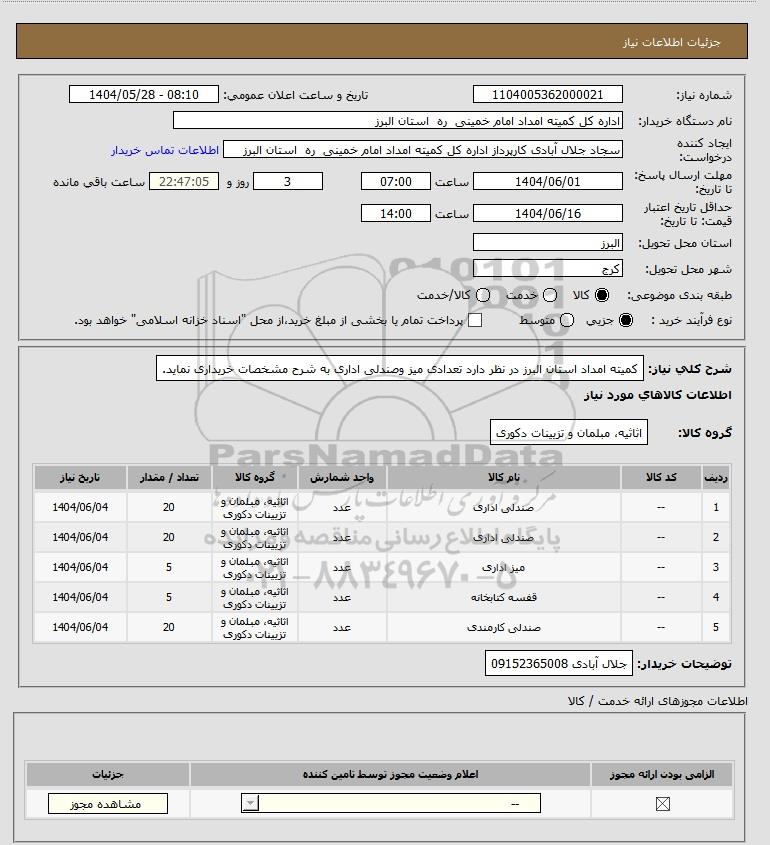 شرح کلی نیاز: کمیته امداد استان البرز در نظر دارد تعدادی میز وصندلی اداری به شرح مشخصات خریداری نماید.