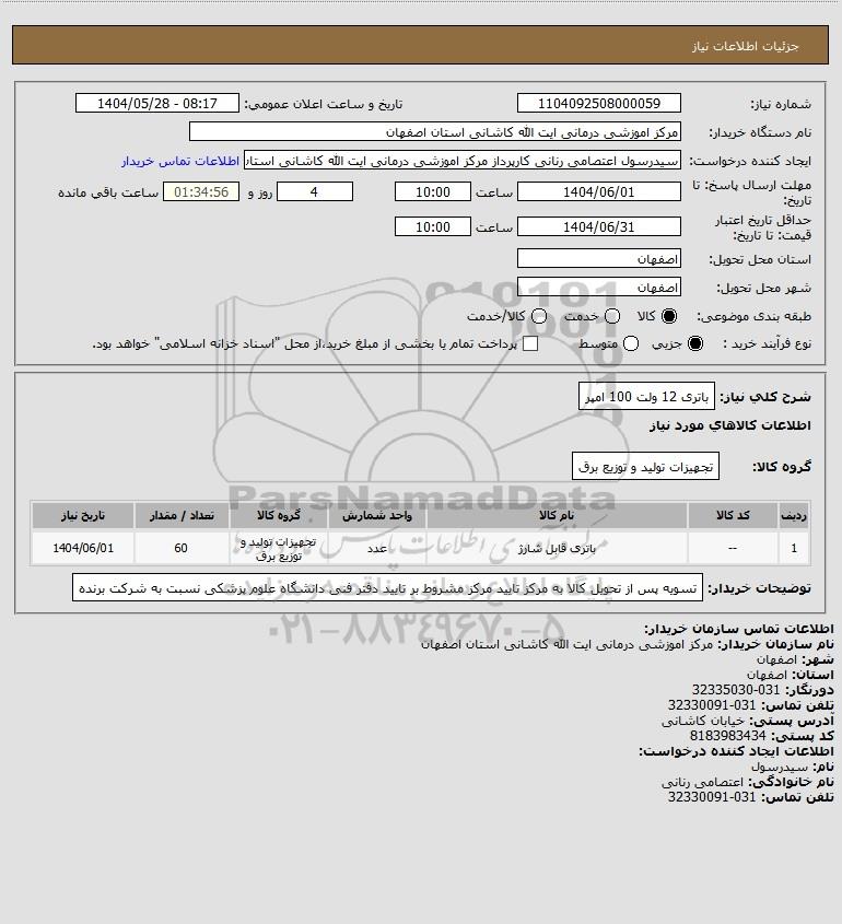 | 1 | -- | باتری قابل شارژ | عدد | تجهیزات تولید و توزیع برق | 60 | 1404/06/01 |