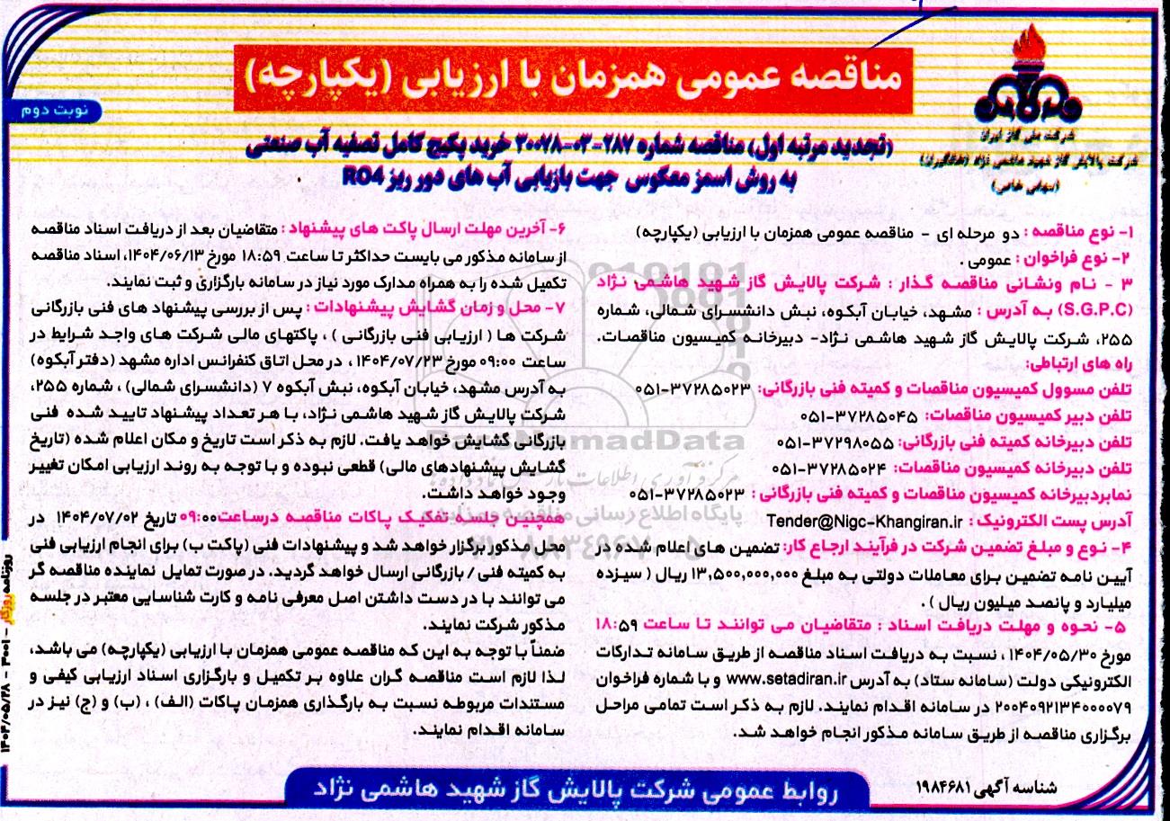 نوبت دوم - تجدید مرتبه اول مناقصه شماره 287-03-30078 خرید پکیج کامل تصفیه آب صنعتی به روش اسمز معکوس جهت بازیابی آب های دور ریز ro4