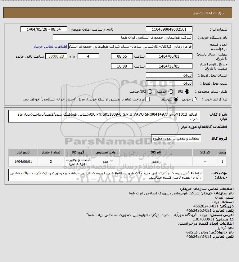 استعلام رادیاتور PN:GR11809-0 G.P.U VAVO SN:00414977 BF6M1013 باکارشناس هماهنگ شود/2عدد/پرداخت:چهار ماه اداری, استعلام رادیاتور PN:GR11809-0 G.P.U VAVO SN:00414977 BF6M1013 باکارشناس هماهنگ شود/2عدد/پرداخت:چهار ماه اداری