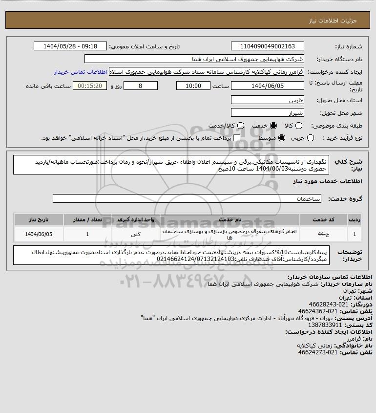 شرح کلی نیاز: نگهداری از تاسیسات مکانیکی.برقی و سیستم اعلان واطفاء حریق شیراز/نحوه و زمان پرداخت:صورتحساب ماهیانه/بازدید حضوری دوشنبه1404/06/03 ساعت 10صبح