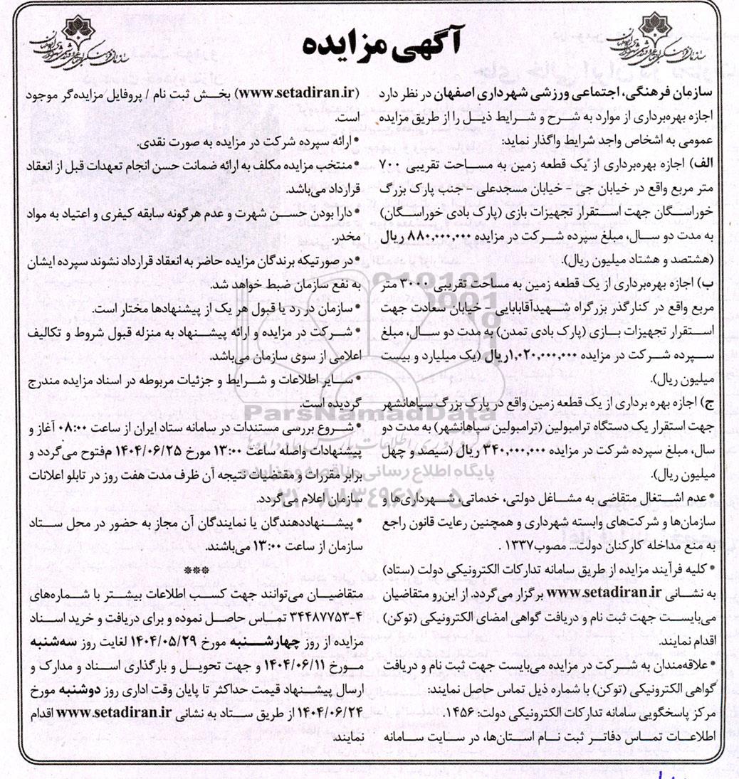 سازمان فرهنگی اجتماعی ورزشی شهرداری اصفهان در نظر دارد اجازه بهره برداری از موارد به شرح و شرایط ذیل را از طریق مزایده عمومی به اشخاص واجد شرایط واگذار نماید.