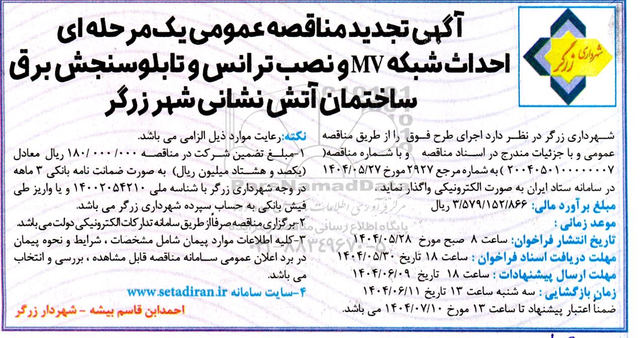 شهرداری زرگر در نظر دارد اجرای طرح فوق را از طریق مناقصه عمومی و با جزئیات مندرج در اسناد مناقصه و با شماره مناقصه 2004050100000007 به شماره مرجع 2927 مورخ 1404.05.27 در سامانه ستاد ایران به صورت الکترونیکی واگذار نماید.