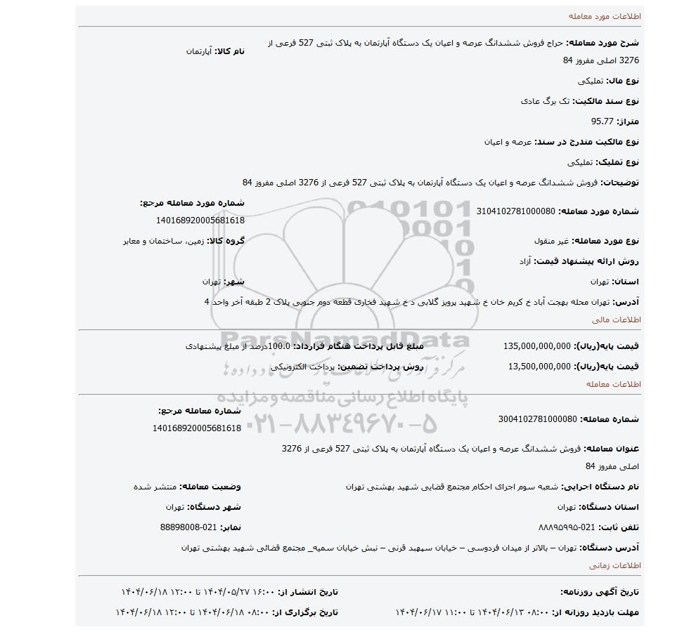 | شماره مورد معامله: 3104102781000080 | شماره مورد معامله مرجع: 140168920005681618 | |