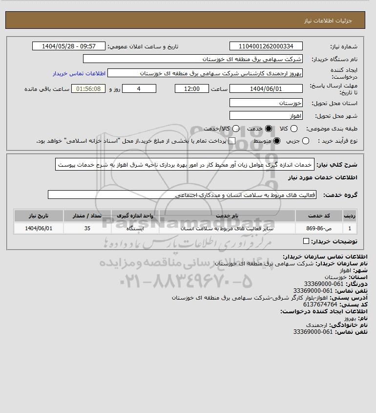 شرح کلی نیاز: خدمات اندازه گیری عوامل زیان آور محیط کار در امور بهره برداری ناحیه شرق اهواز به شرح خدمات پیوست