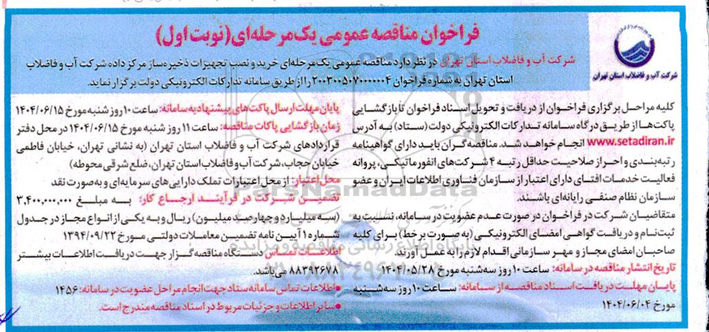 شرکت آب و فاضلاب استان تهران در نظر دارد مناقصه عمومی یک مرحله ای خرید و نصب تجهیزات ذخیره ساز مرکز داده شرکت آب و فاضلاب استان تهران به شماره فراخوان 2003005070000004 را از طریق سامانه تدارکات الکترونیکی دولت برگزار نماید.