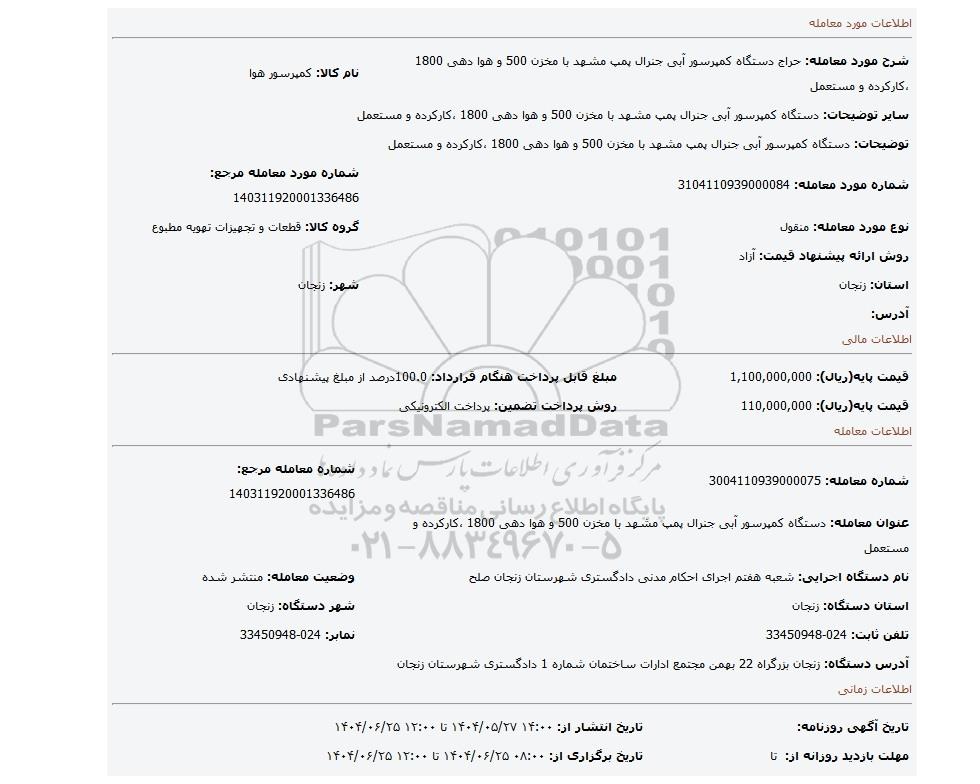 | شماره مورد معامله: 3104110939000084 | شماره مورد معامله مرجع: 140311920001336486 | |