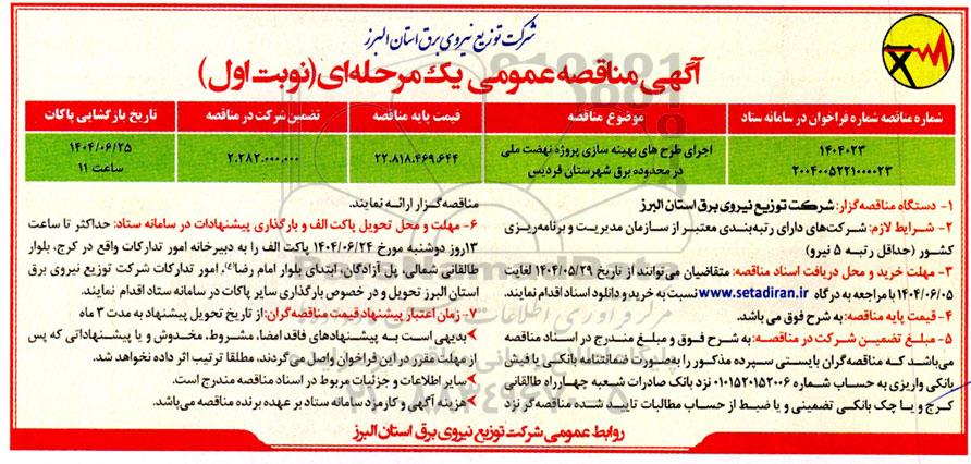 اجرای طرح های بهینه سازی پروژه نهضت ملی در محدوده برق شهرستان فردیس | 22.818.469.644 | 2.282.000.000 | 1404.6.25 ساعت 11 |