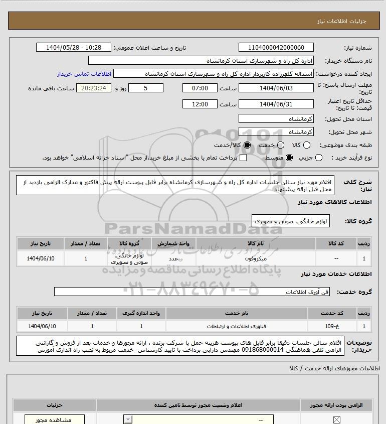 شرح کلی نیاز: اقلام مورد نیاز سالن جلسات اداره کل راه و شهرسازی کرمانشاه برابر فایل پیوست ارائه پیش فاکتور و مدارک الزامی بازدید از محل قبل ارائه پیشنهاد