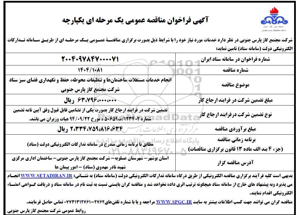 شرکت مجتمع گاز پارس جنوبی در نظر دارد خدمات مورد نیاز خود را با شرایط ذیل به صورت برگزاری مناقصه عمومی یک مرحله ای از طریق سامانه تدارکات الکترونیکی دولت (سامانه ستاد) تامین نماید:
