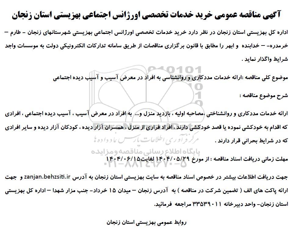 آگهی مناقصه عمومی خرید خدمات تخصصی اورژانس اجتماعی بهزیستی استان زنجان