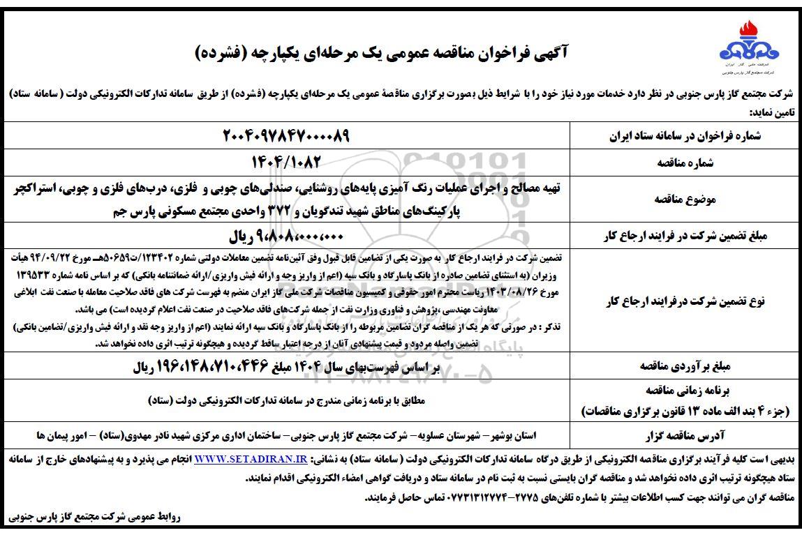 شرکت مجتمع گاز پارس جنوبی در نظر دارد خدمات مورد نیاز خود را با شرایط ذیل بصورت برگزاری مناقصه عمومی یک مرحله ای یکپارچه (فشرده) از طریق سامانه تدارکات الکترونیکی دولت (سامانه ستاد) تامین نماید