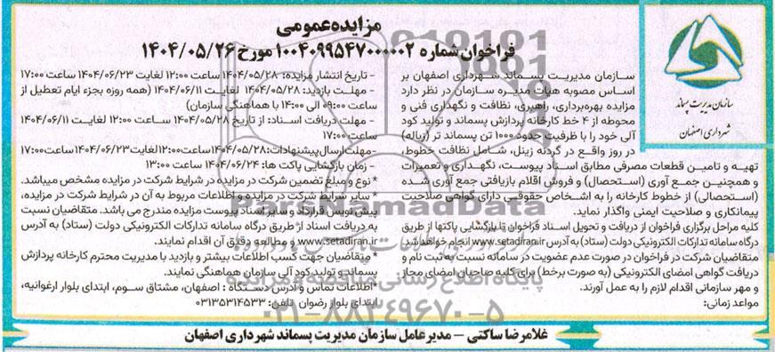 سازمان مدیریت پسماند شهرداری اصفهان بر اساس مصوبه هیات مدیره سازمان در نظر دارد مزایده بهره برداری، راهبری، نظافت و نگهداری فنی و محوطه از 4 خط کارخانه پردازش پسماند و تولید کود آلی خود را با ظرفیت حدود 1000 تن پسماند تر (زباله) در روز واقع در گردنه زینل، شامل نظافت خطوط، تهیه و تامین قطعات مصرفی مطابق اسناد پیوست، نگهداری و تعمیرات و همچنین جمع آوری (استحصال) و فروش اقلام بازیافتی جمع آوری شده استحصالی از خطوط کارخانه را به اشخاص حقوقی دارای گواهی صلاحیت پیمانکاری و صلاحیت ایمنی واگذار نماید.
