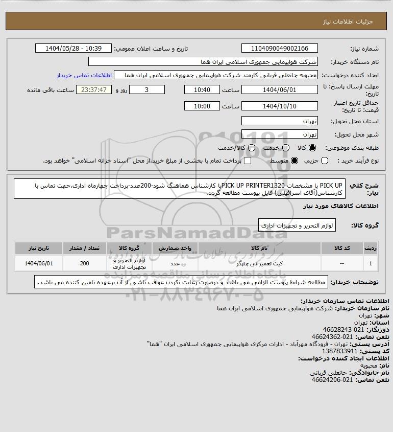 شرح کلی نیاز: PICK UP با مشخصات PICK UP PRINTER1320با کارشناس هماهنگ شود-200عدد-پرداخت چهارماه اداری،جهت تماس با کارشناس(آقای اسرافیلی) فایل پیوست مطالعه گردد.