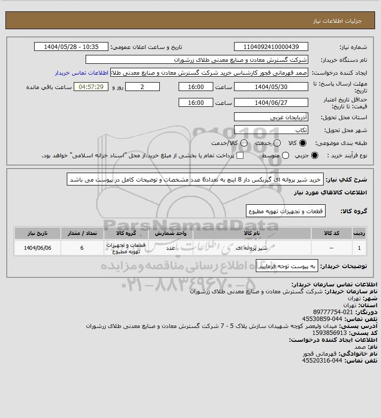 شرح کلی نیاز: خرید شیر پروانه ای گیربکس دار 8 اینچ به تعداد6 عدد مشخصات و توضیحات کامل در پیوست می باشد