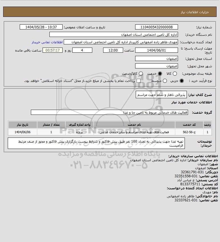 توضیحات خریدار:تهیه غذا جهت پذیدائی به تعداد 100 نفر طبق پیش فاکتور و شرایط پیوست