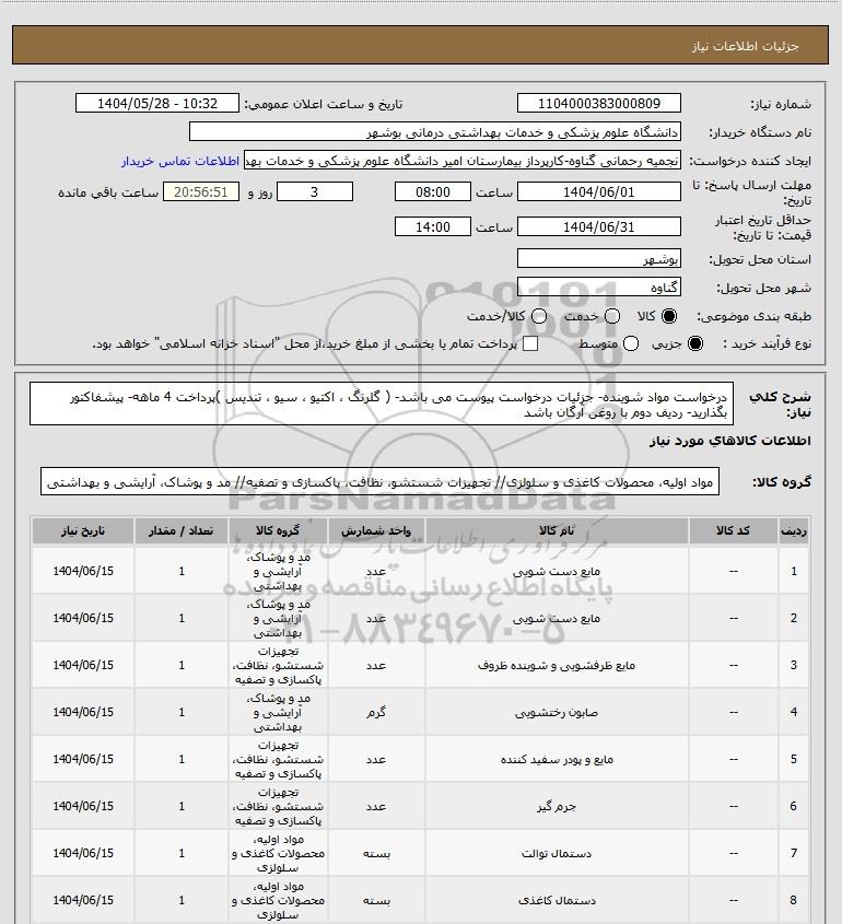 شرح کلی نیاز: درخواست مواد شوینده- جزئیات درخواست پیوست می باشد- ( گلرنگ ، اکتیو ، سیو ، تندیس )پرداخت 4 ماهه- پیشفاکتور بگذارید- ردیف دوم با روغن آرگان باشد