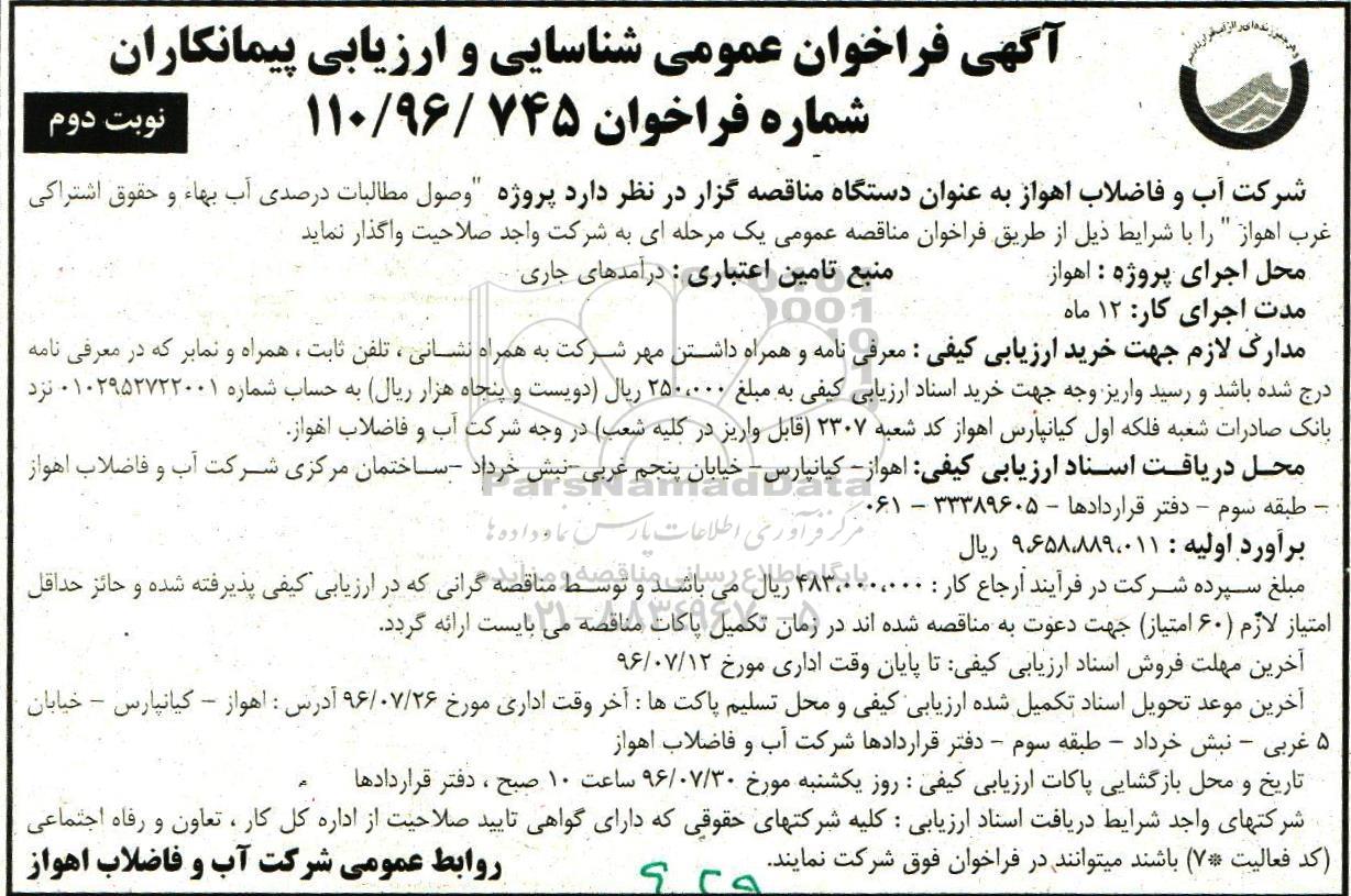 شرکت آب و فاضلاب اهواز بعنوان دستگاه مناقصه گزار در نظر دارد پروژه وصول مطالبات درصدی آب بهاء و حقوق اشتراکی غرب اهواز را با شرایط ذیل از طریق فراخوان مناقصه عمومی یک مرحله ای به شرکت واجد صلاحیت واگذار نماید
