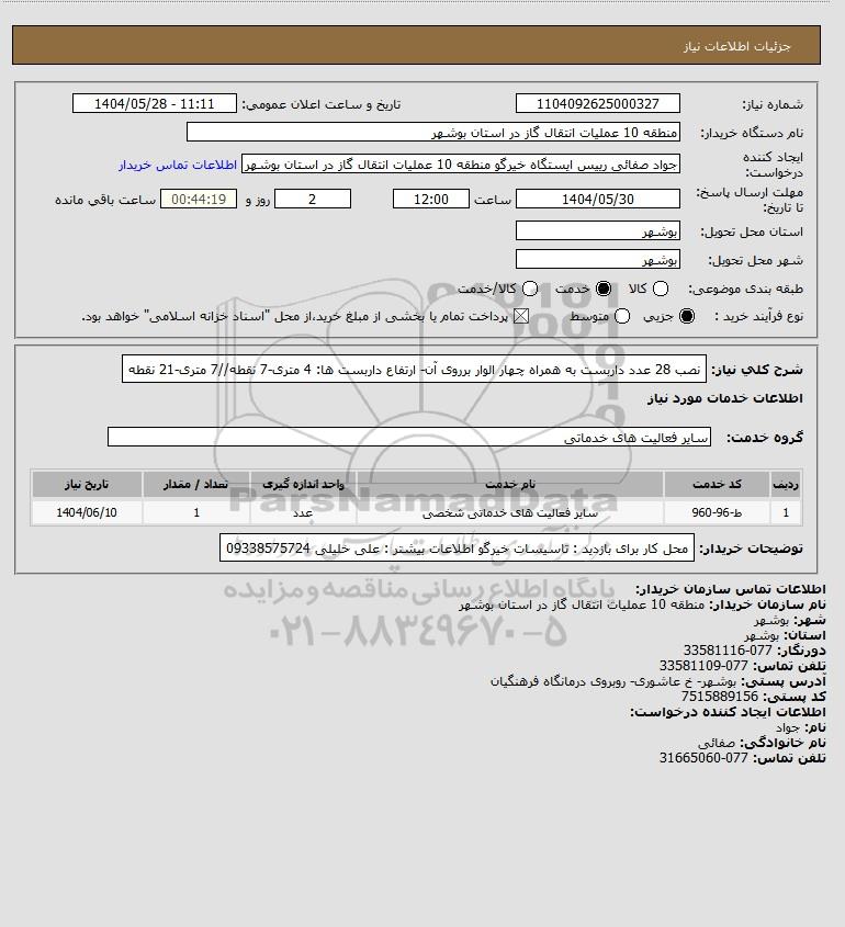 شرح کلی نیاز: نصب 28 عدد داربست به همراه چهار الوار برروی آن- ارتفاع داربست ها: 4 متری-7 نقطه//7 متری-21 نقطه