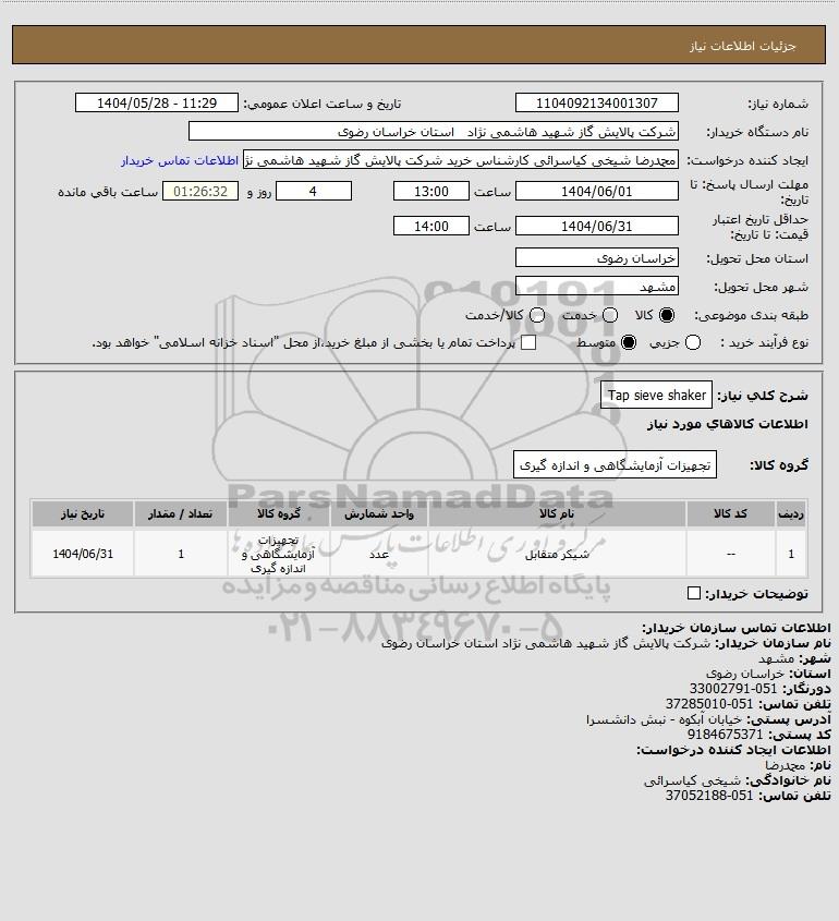 نام دستگاه خریدار:شرکت پالایش گاز شهید هاشمی نژاد استان خراسان رضوی