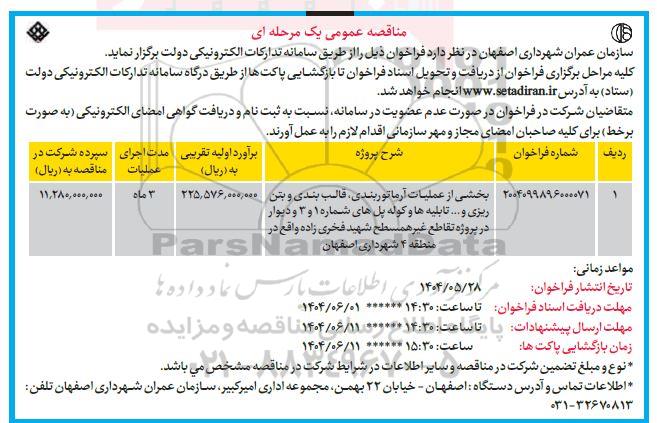 1 22004099896000071 بخشی از عملیات آرماتوربندی، قالب بندی و بتن ریزی و ... تابلیه ها و کوله پل های شماره 1 و 3 و دیوار در پروژه تقاطع غیرهمسطح شهید فخری زاده واقع در منطقه 4 شهرداری اصفهان  225.576.000.000 3 ماه  11.280.000.000