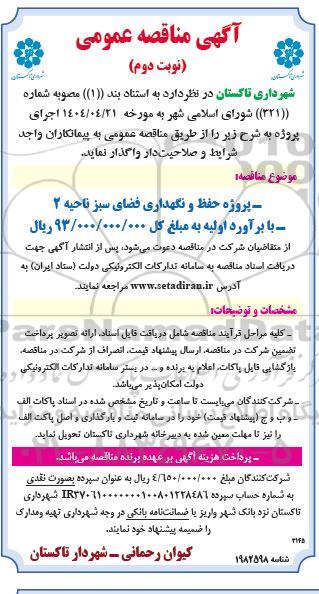 مناقصه پروژه حفظ و نگهداری فضای سبز ناحیه 2- نوبت دوم از کلیه افراد متخصص و شرکتها واجد شرایط دعوت به عمل میآید در مناقصه با کد خبرگزاری پارس نماد: 9430335 شرکت نمایند.