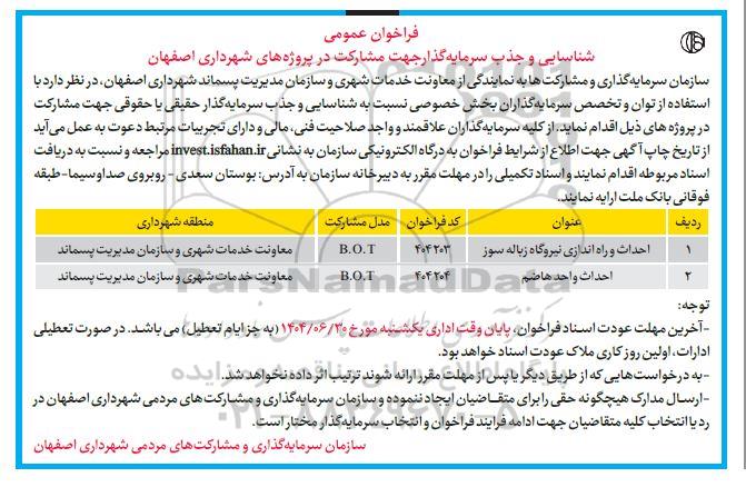 سازمان سرمایه گذاری و مشارکتها به نمایندگی از معاونت خدمات شهری و سازمان مدیریت پسماند شهرداری اصفهان در نظر دارد با استفاده از توان و تخصص سرمایه گذاران بخش خصوصی نسبت به شناسایی و جذب سرمایه گذار حقیقی یا حقوقی جهت مشارکت در پروژه های ذیل اقدام نماید از کلیه سرمایه گذاران علاقمند و واجد صلاحیت فنی مالی و دارای تجربیات مرتبط دعوت به عمل می آید از تاریخ چاپ آگهی جهت اطلاع از شرایط فراخوان به درگاه الکترونیکی سازمان به نشانی invest.isfahan.ir مراجعه و نسبت به دریافت اسناد مربوطه اقدام نمایند و اسناد تکمیلی را در مهلت مقرر به دبیرخانه سازمان به آدرس بوستان سعدی - روبروی صدا و سیما - طبقه فوقانی بانک ملت ارایه نمایند.