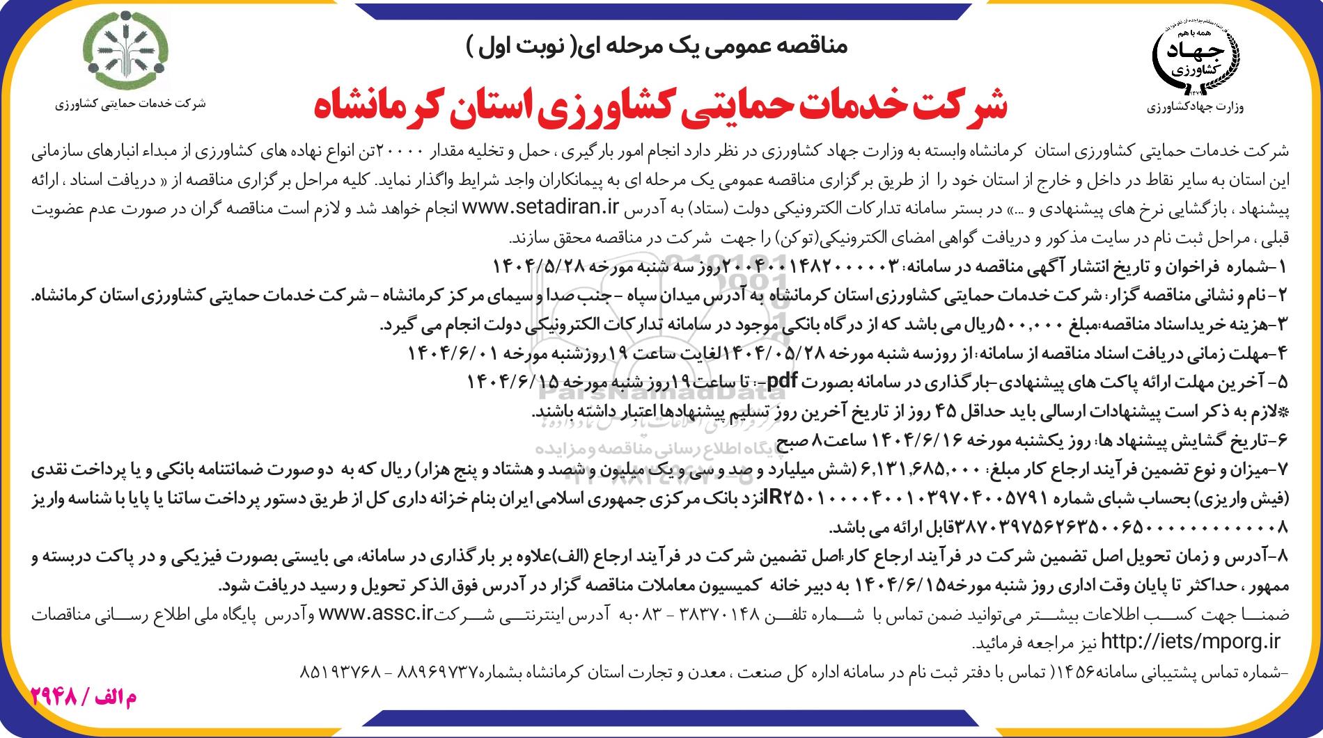 شرکت خدمات حمایتی کشاورزی استان کرمانشاه وابسته به وزارت جهاد کشاورزی در نظر دارد انجام امور بارگیری حمل و تخلیه مقدار 20000 تن انواع نهاده های کشاورزی از مبداء انبارهای سازمانی این استان به سایر نقاط در داخل و خارج از استان خود را از طریق برگزاری مناقصه عمومی یک مرحله ای به پیمانکاران واجد شرایط واگذار نماید. کلیه مراحل برگزاری مناقصه از « دریافت اسناد ، ارائه پیشنهاد ، بازگشایی نرخهای پیشنهادی و .... در بستر سامانه تدارکات الکترونیکی دولت (سناد) به آدرس سایت ستاد ایران انجام خواهد شد و لازم است مناقصه گران در صورت عدم عضویت