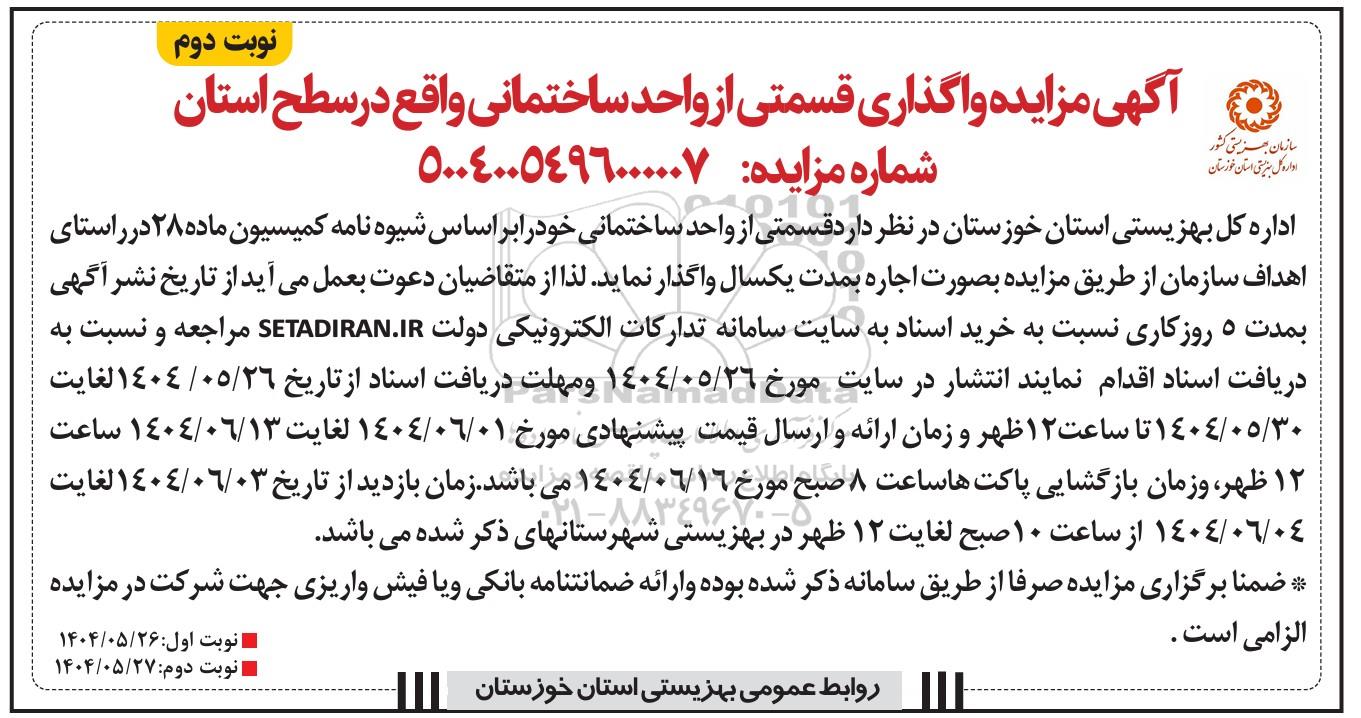 مزایده عمومی مزایده واگذاری قسمتی از واحد ساختمانی واقع در سطح استان - نوبت دوم برگزار میگردد. از کلیه افراد متخصص و شرکت‌های واجد شرایط دعوت به عمل می‌آید تا در این مزایده با کد خبرگزاری پارس نماد : 9430703 شرکت نمایند تاریخ شروع مزایده : 1404/05/28 مهلت شرکت در مزایده: تا پایان روز 1404/05/30 مکان برگزاری اموال واگذاری استان‌های مزایدات استان خوزستان و دسته‌بندی‌های مربوط به این حراجی واگذاری ورزشگاه، پارکینگ، غرفه و بوفه میباشد.