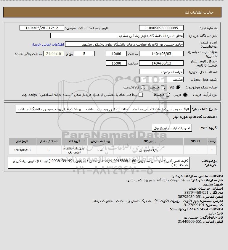 استعلام اتری یو پی اس 12 ولت 28 آمپرساعت _ اطلاعات فنی پیوست میباشد _ پرداخت طبق روال عمومی دانشگاه میباشد, استعلام اتری یو پی اس 12 ولت 28 آمپرساعت _ اطلاعات فنی پیوست میباشد _ پرداخت طبق روال عمومی دانشگاه میباشد