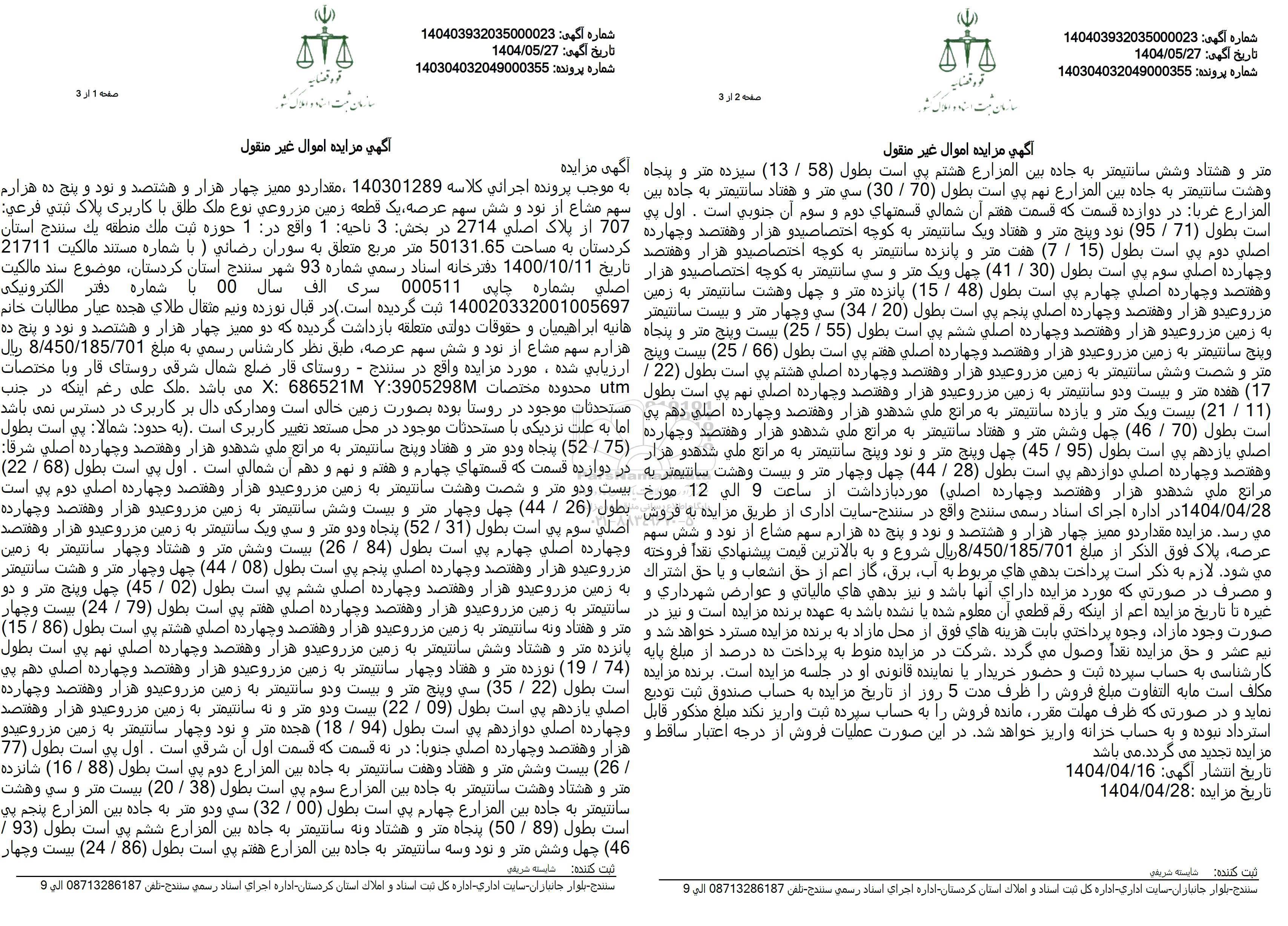 مزایده فروش یک قطعه زمین مزروعی به پلاک فرعی 707 از پلاک اصلی 2714