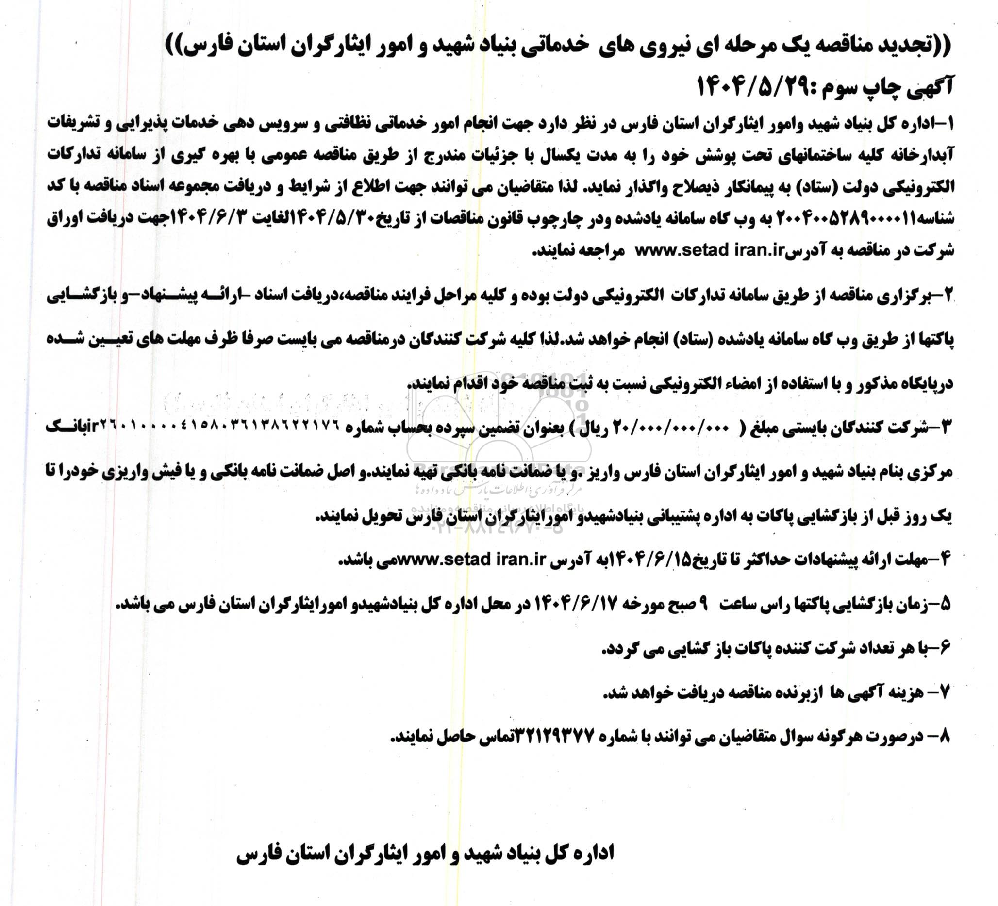 1. اداره کل بنیاد شهید و امور ایثارگران استان فارس در نظر دارد جهت انجام امور خدماتی نظافتی و سرویس دهی خدمات پذیرایی و تشریفات آبدارخانه کلیه ساختمانهای تحت پوشش خود را به مدت یکسال با جزئیات مندرج از طریق مناقصه عمومی با بهره گیری از سامانه تدارکات الکترونیکی دولت (ستاد) به پیمانکار ذیصلاح واگذار نماید لذا متقاضیان میتوانند جهت اطلاع از شرایط و دریافت مجموعه اسناد مناقصه با کد شناسه 2004005289000011 به وب گاه سامانه یاد شده و در چارچوب قانون مناقصات از تاریخ 1404.5.30 لغایت 1404.6.3 جهت دریافت اوراق شرکت در مناقصه به آدرس سایت ستاد ایران مراجعه نمایند.