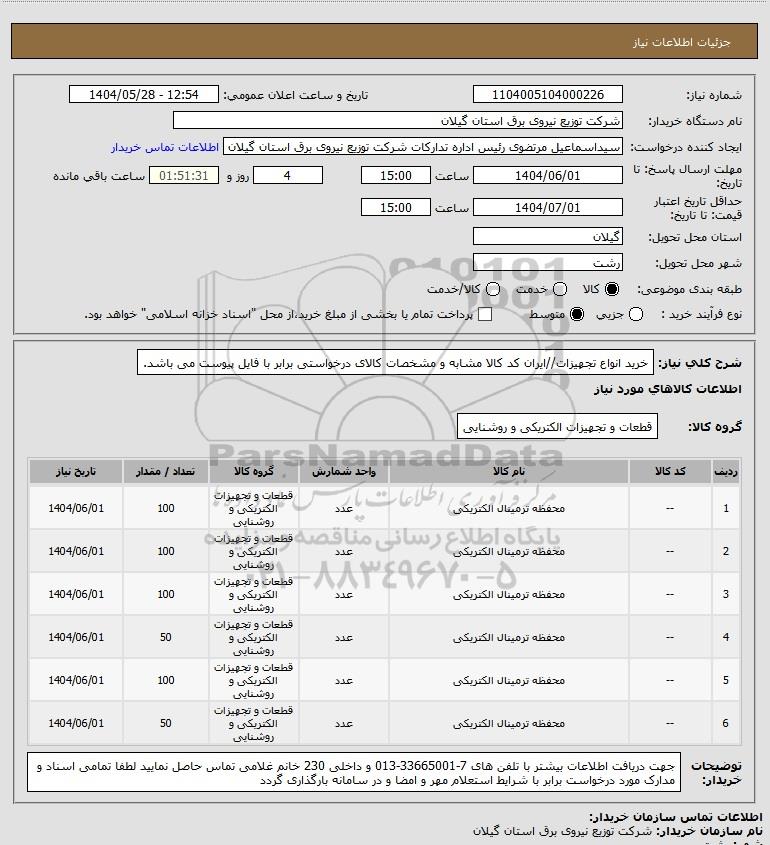 | 4 | -- | محفظه ترمینال الکتریکی | عدد | قطعات و تجهیزات الکتریکی و روشنایی | 50 | 1404/06/01 |