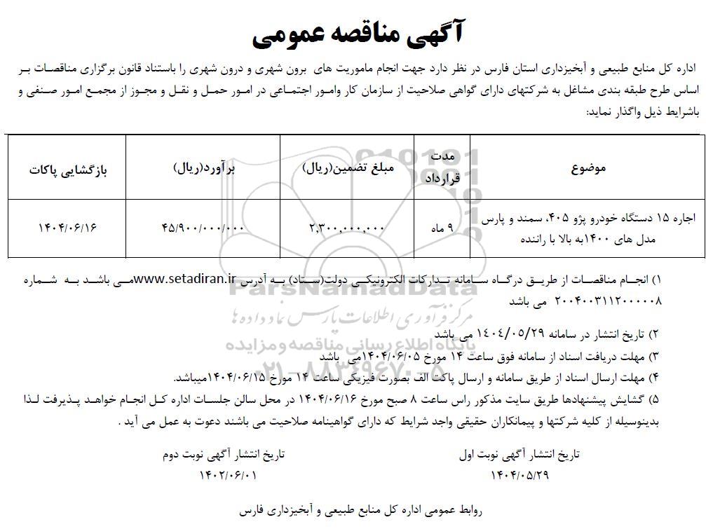 مناقصه اجاره 15 دستگاه خودرو پژو 405، سمند و پارس مدل های 1400 به بالا با راننده از کلیه افراد متخصص و شرکت‌ها واجد شرایط دعوت به عمل می‌آید در مناقصه با کد خبرگزاری پارس نماد: 9430997 شرکت نمایند. این مناقصه در تاریخ 1404/05/29 شروع و مهلت آن تا تاریخ 1404/06/05 میباشد.