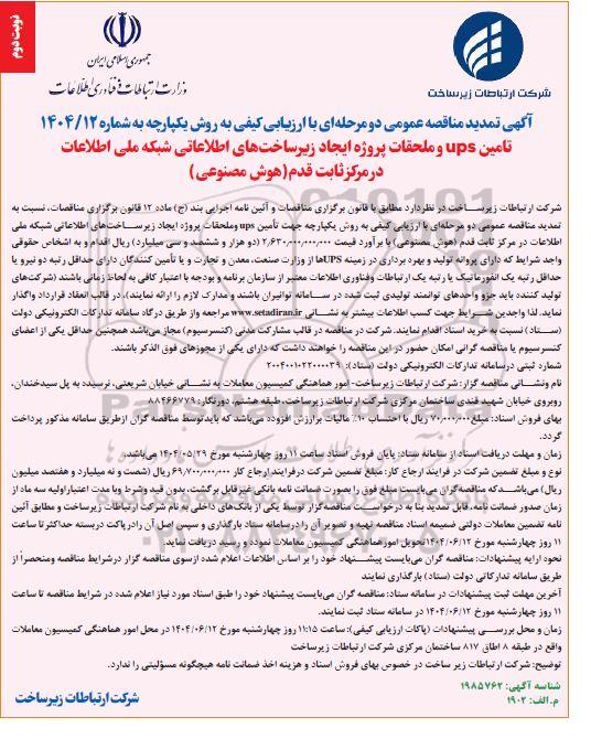 شرکت ارتباطات زیر ساخت در نظر دارد نسبت به برگزاری مناقصه عمومی دو مرحله ای با ارزیابی کیفی به روش یکپارچه جهت تامین UPS و ملحقات پروژه ایجاد زیر ساخت های اطلاعاتی شبکه ملی اطلاعات در مرکز ثابت قدم (هوش مصنوعی) با برآورد قیمت 2.630.000.000 (دو هزار و ششصد و سی میلیارد) ریال اقدام و به اشخاص حقوقی واجد شرایط که دارای پروانه تولید و بهره برداری در زمینه UPS ها از وزارت صنعت، معدن و تجارت و با تامین کنندگان دارای حداقل رتبه دو نیرو معتبر از سازمان برنامه و بودجه با اعتبار کافی به لحاظ زمانی باشند (شرکتهای تولید کنند ه باید جزو واحدهای توانمند تولیدی ثبت شده در سامانه توانیران باشند و مدارک لازم را ارائه نمایند)، در قالب انعقاد قرارداد واگذار نماید. لذا واجدین شرایط جهت کسب اطلاعات بیشتر به نشانی سایت ستاد ایران مراجعه و از طریق درگاه سامانه تدارکات الکترونیکی دولت (اسناد) نسبت به خرید اسناد اقدام نمایند.
