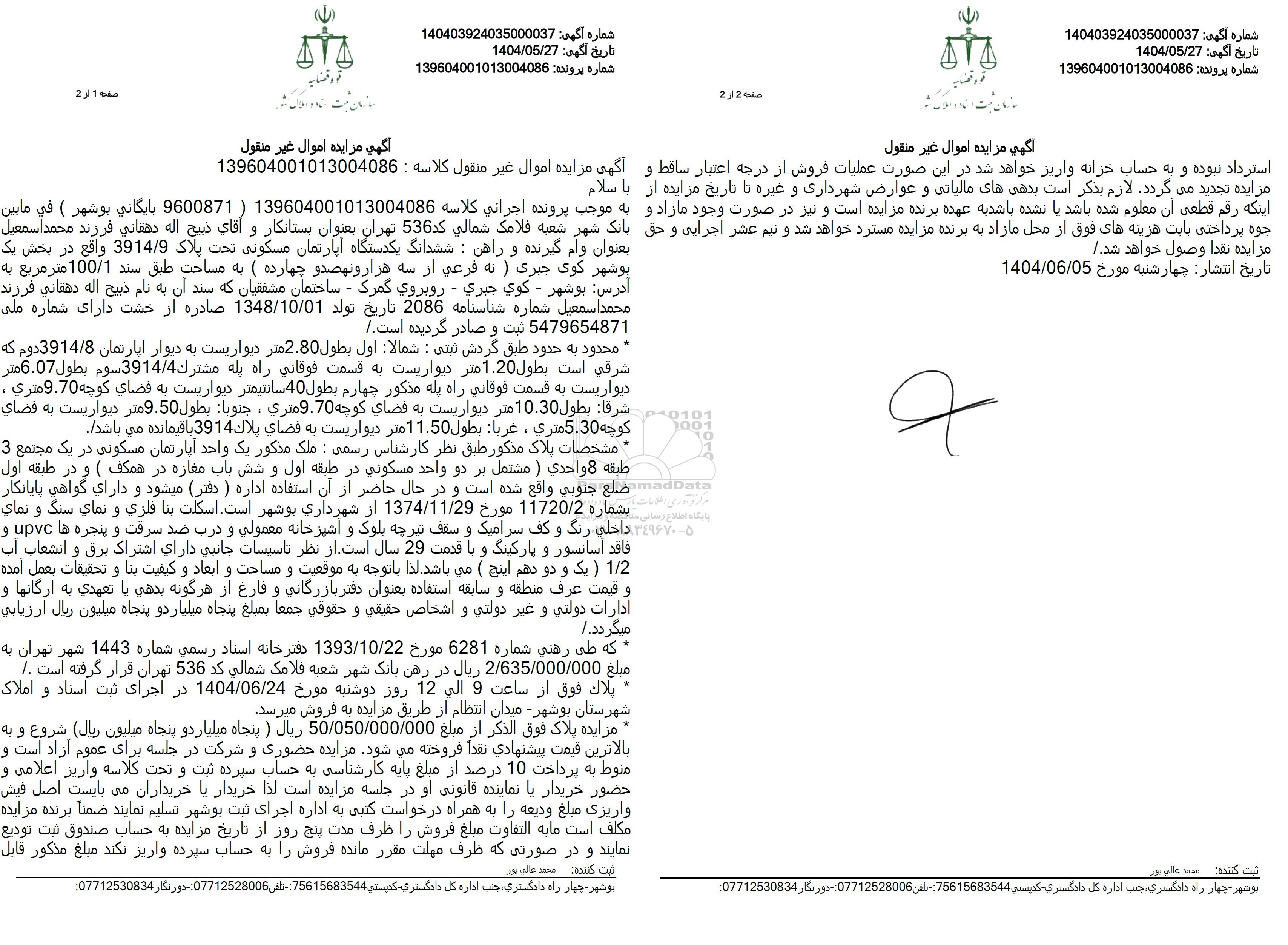 مزایده عمومی مزایده فروش یکدستگاه آپارتمان مسکونی تحت پلاک 391.4 برگزار میگردد. از کلیه افراد متخصص و شرکتهای واجد شرایط دعوت به عمل میآید تا در این مزایده با کد خبرگزاری پارس نماد : 9431035 شرکت نمایند تاریخ شروع مزایده : 1404/05/27 مهلت شرکت در مزایده: تا پایان روز 1404/06/24 مکان برگزاری اموال واگذاری استانهای بوشهر و دستهبندیهای مربوط به این حراجی املاک و زمین میباشد.