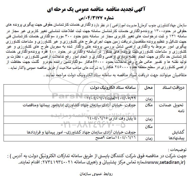 سازمان جهاد کشاورزی جنوب کرمان (مدیریت امور اراضی) در نظر دارد واگذاری خدمات کارشناسان حقوقی جهت پیگیری پرونده های حقوقی در حدود 1300 پرونده - واگذاری خدمات کارشناسان سامانه جهت ثبت اطلاعات شناسایی تغییر کاربری غیر مجاز در سامانه 131 و ثبت درخواستهای تغییر کاربری مجاز در سامانه pm حدود 300 مورد - واگذاری خدمات کارشناسان فنی جهت تشکیل و تنظیم پرونده متقاضیان دریافت زمین جهت اجرای طرح های کشاورزی و غیر کشاورزی و مشاعات کشاورزی پیگیری امور مربوط به واگذاری اراضی شامل بررسی پرونده های واگذار شده به مجریان طرح های کشاورزی و غیر کشاورزی و مشاعات کشاورزی، ثبت پرونده های مذکور در سامانه واگذاری در حدود 400 فقره پرونده - واگذاری خدمات کارشناسان حد نگاری جهت انجام نقشه برداری اراضی واگذاری و انجام امور رفع تداخلات اراضی کشاورزی ، نظارت بر تولید نقشه ها و تفسیر عکس طرح رفع تداخلات حدود 55000 هکتار - واگذار تامین راننده خودرو گشت جهت حفاظت از اراضی کشاورزی در سطح منطقه حدود 245000 هکتار را به شرکت های صاحب صلاحیت از طریق مناقصه عمومی واگذار نماید .