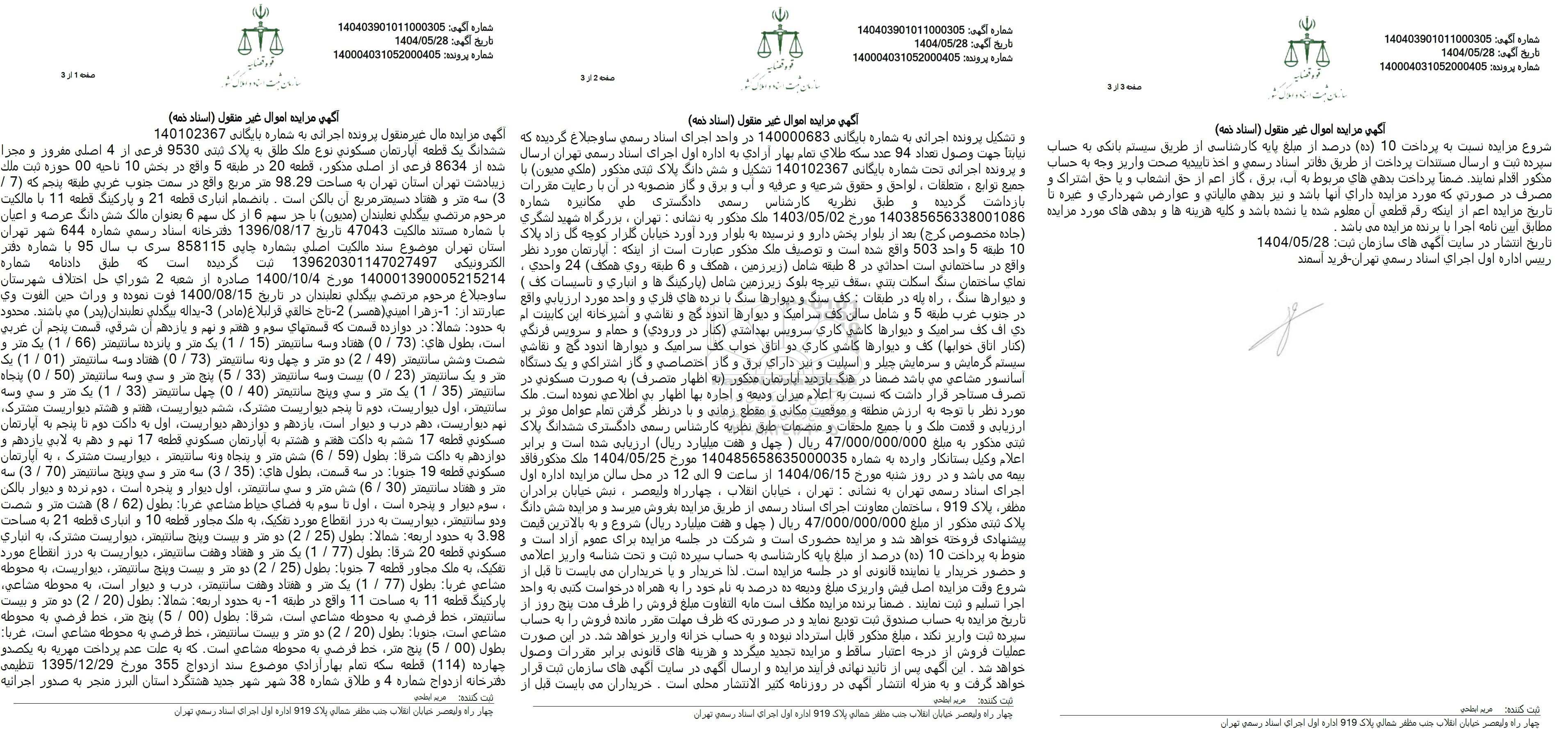 مزایده فروش یک قطعه آپارتمان مسکونی به پلاک ثبتی 9530 فرعی از 4 اصلی به مبلغ 47.000.000.000 ریال