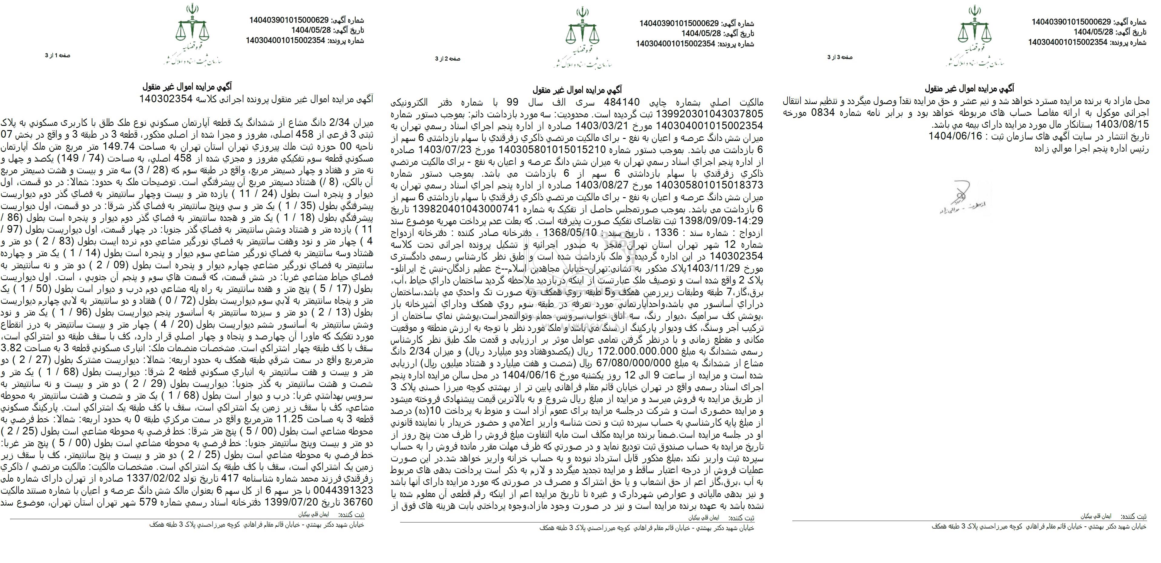 مزایده میزان 2.34 دانگ مشاع از ششدانگ یک قطعه آپارتمان مسکونی نوع ملک طلق با کاربری مسکونی به پلاک ثبتی 3 فرعی از 458 اصلی، مفروز و مجزا شده از اصلی