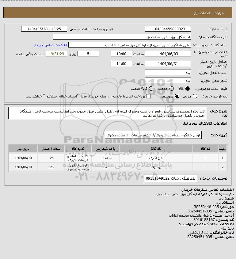 استعلام بها و موضوع استعلام استعلام تعداد125عددمیزکارشناسی همراه با ست رومیزی قهوه ایی طبق عکس طبق جدول وشرایط لیست پیوست تامین کنندگان جدول راتکمیل ودرسامانه بارگذاری نمایند به اطلاع کلیه شرکتها و افراد متخصص واجد شرایط میرساند، آگهی گذار در نظر دارد از طریق استعلام بها، نسبت به انتخاب و دریافت پیشنهادات اقدام نماید. این استعلام با کد آگهی ثبت شده در سامانه خبرگزاری پارس نماد : 9431625 منتشر شده است. مشخصات استعلام : تاریخ شروع استعلام: 1404/05/28 آخرین مهلت ارسال پیشنهاد قیمت : 1404/06/03 و محل اجرای پروژه : استان یزد میباشد. استعلام قیمت مورد درخواست : استعلام تعداد125عددمیزکارشناسی همراه با ست رومیزی قهوه ایی طبق عکس طبق جدول وشرایط لیست پیوست تامین کنندگان جدول راتکمیل ودرسامانه بارگذاری نمایند با دستهبندیهای تخصصی و گروه های مرتبط : مصنوعات چوبی و مبلمان اداری, استعلام اطلاع رسانی میگردد.