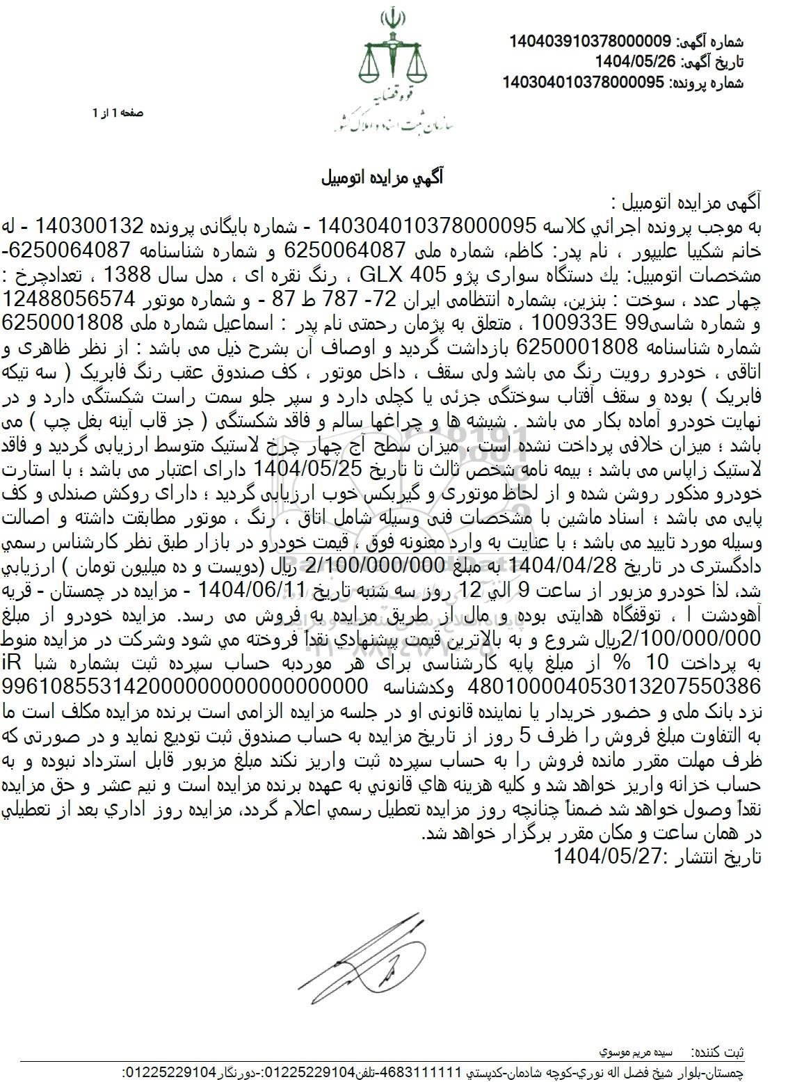 مزایده فروش یک دستگاه سواری پژو GLX 405 ، رنگ نقره ای مدل 1388