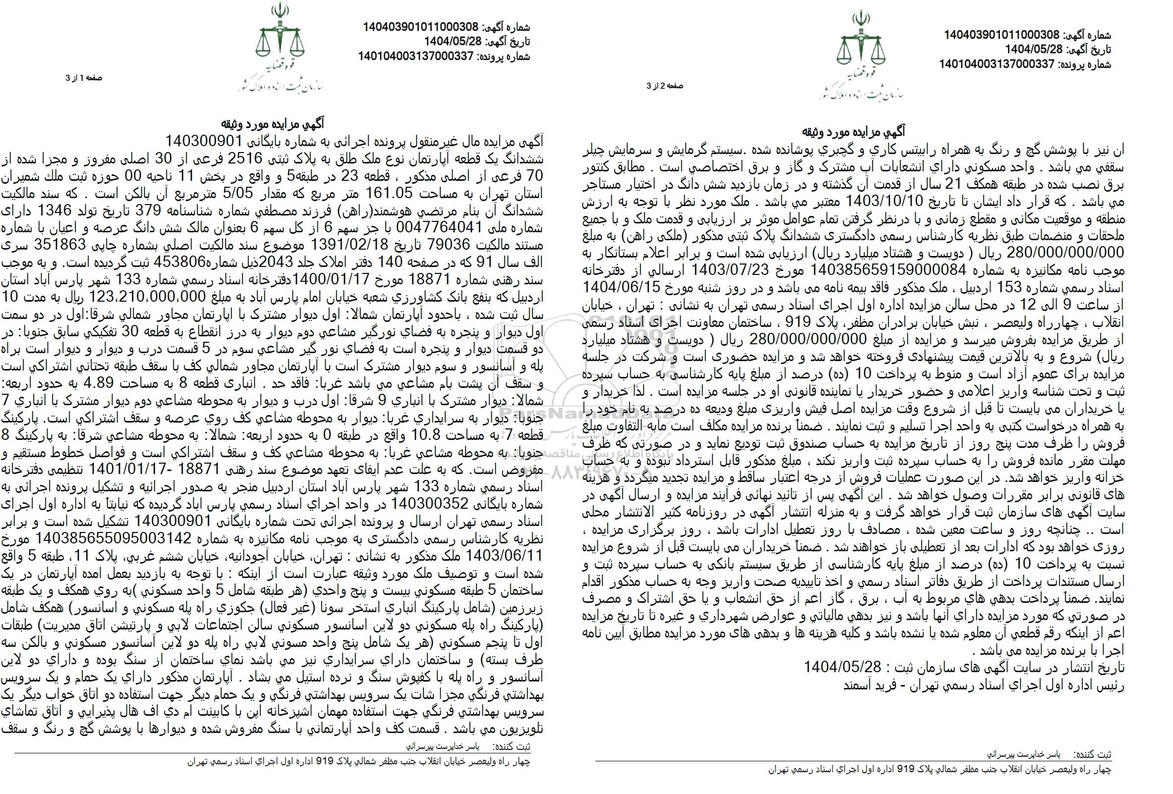 مزایده ششدانگ یک قطعه آپارتمان نوع ملک طلق به پلاک ثبتی 2516 فرعی از 30 اصلی
