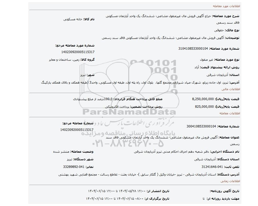 | عنوان معامله: آگهی فروش مال غیرمنقول مشاعی- ششدانگ یک واحد آپارتمان مسکونی فاقد سند رسمی | ||