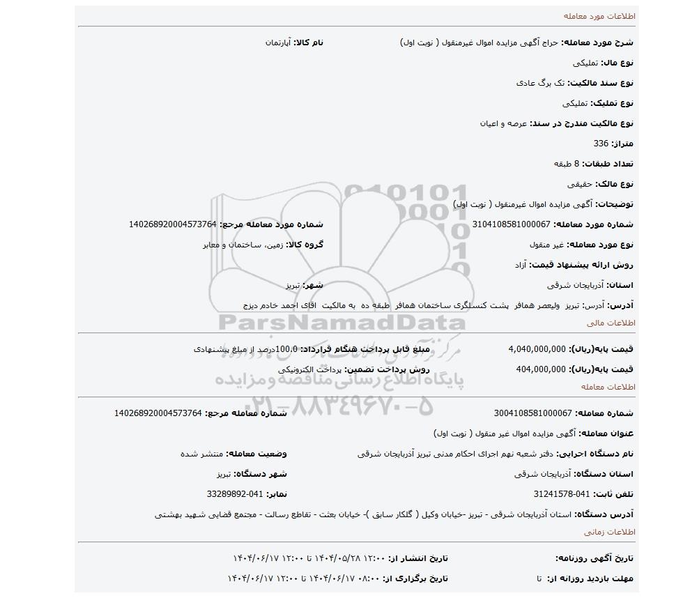 | شرح مورد معامله: حراج آگهی مزایده اموال غیرمنقول ( نوبت اول) | نام کالا: آپارتمان | |