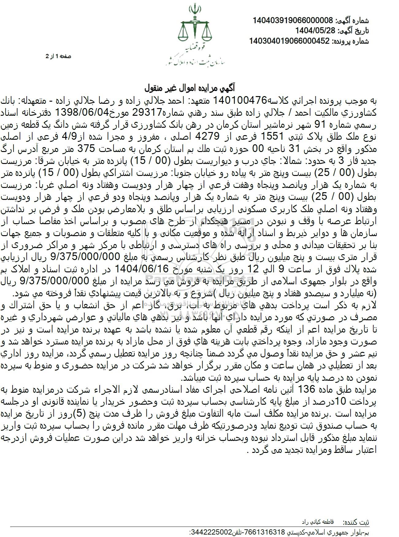 مزایده فروش ششدانگ یک قطعه زمین با پلاک ثبتی 1551 فرعی از 4279 اصلی