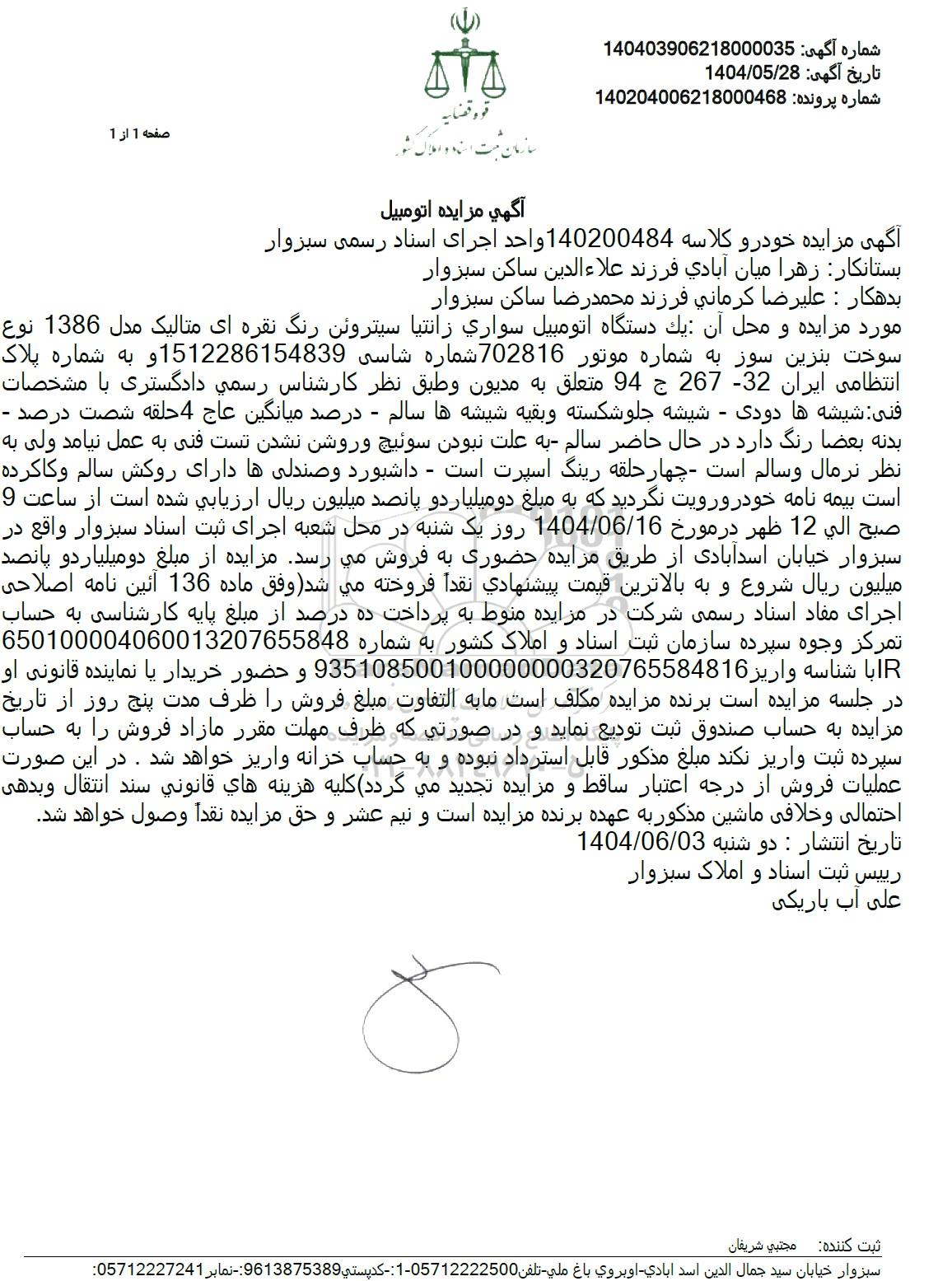 مزایده فروش یک دستگاه اتومبیل سواری زانتیا سیتروئن رنگ نقره ای
