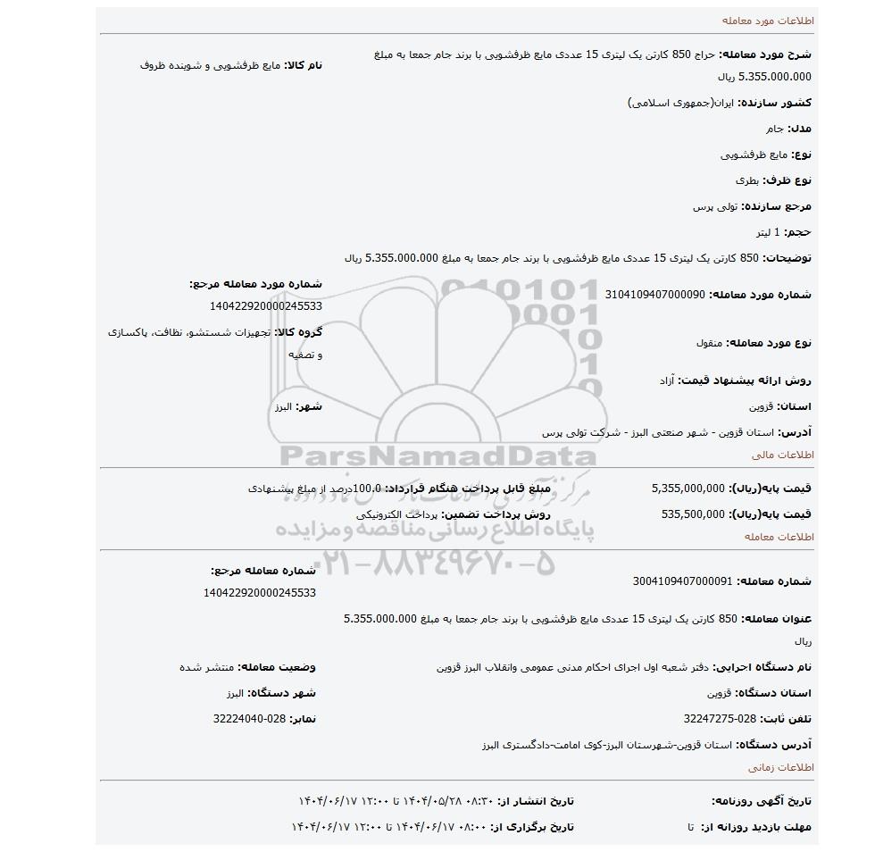 توضیحات: 850 کارتن یک لیتری 15 عددی مایع ظرفشویی با برند جام جمعا به مبلغ 5.355.000.000 ریال | ||