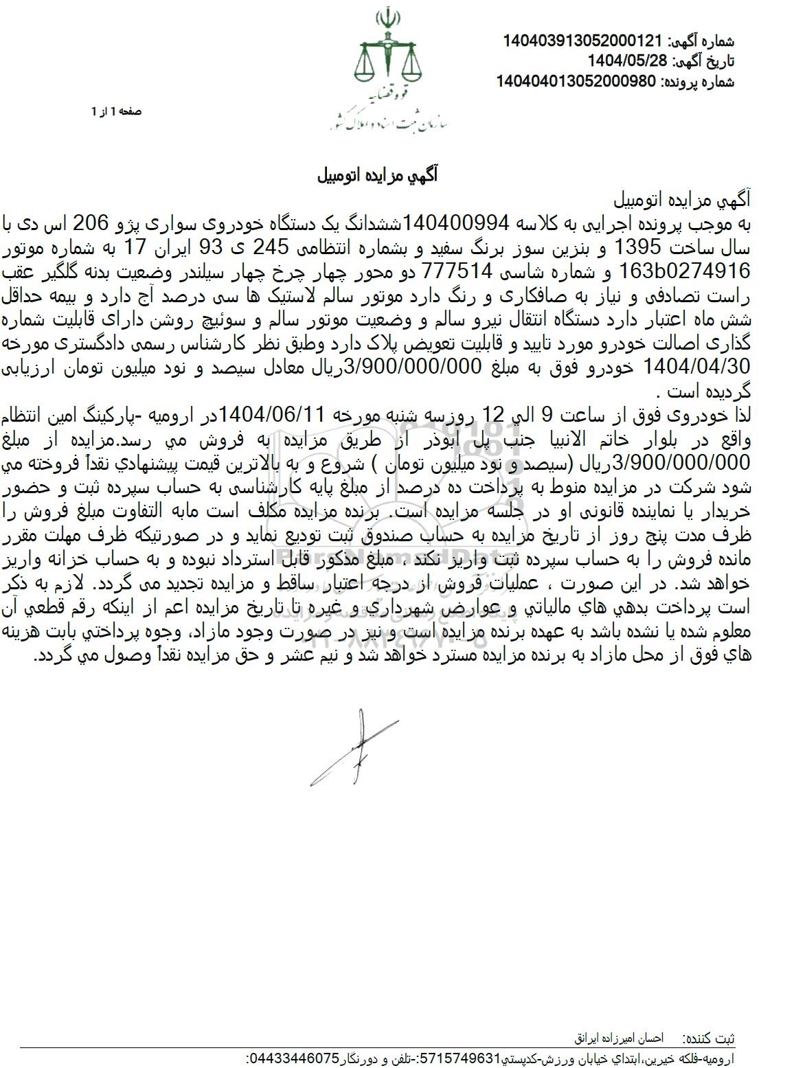 مزایده فروش یک دستگاه خودرو پژو 206 مدل 1395