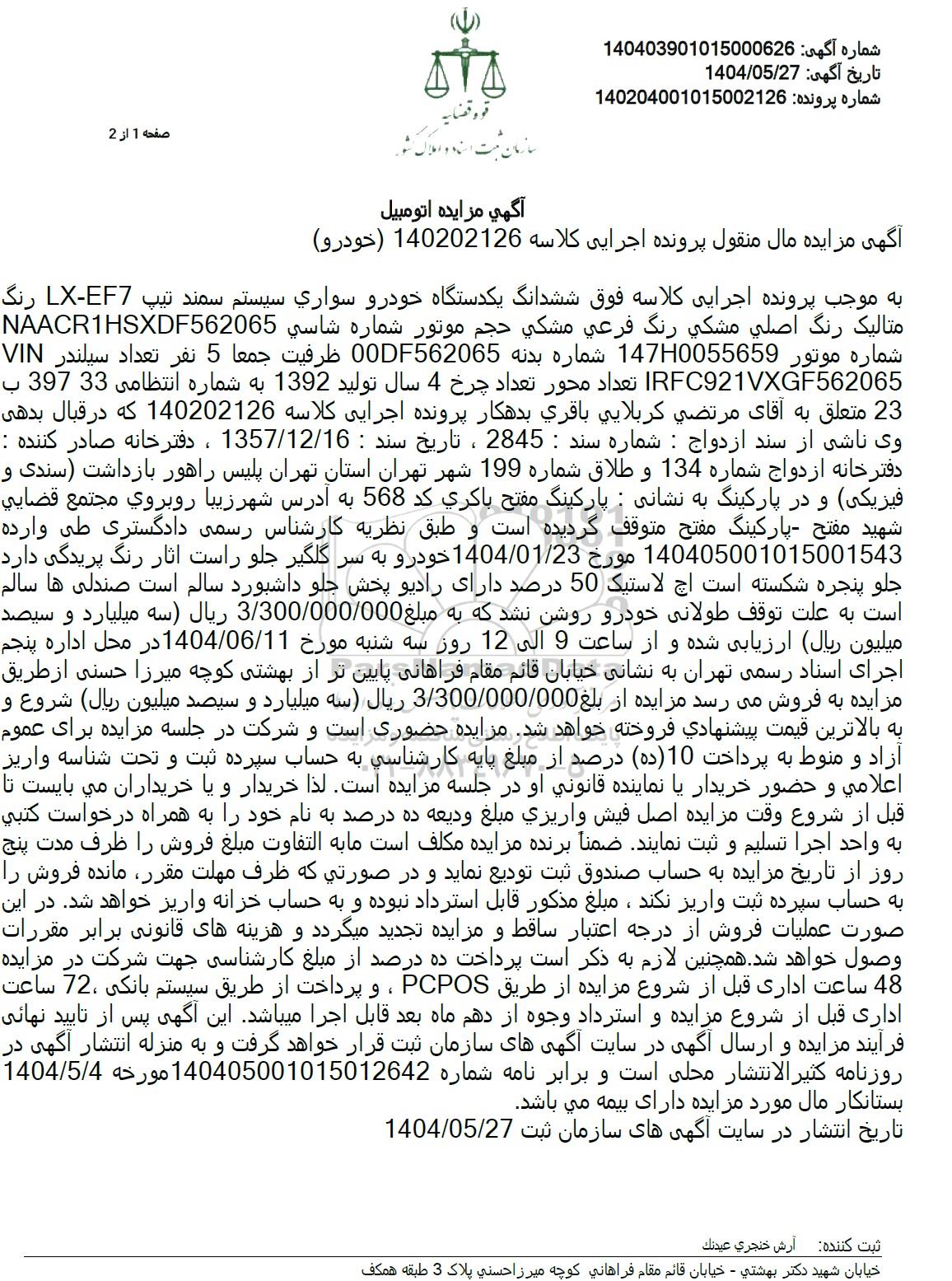 9 مزایده فروش خودرو دناDENA+EF7-TCA مدل: 1401 رنگ: مشکی متالیک 9653621 1404/07/14 new not special not payed فارس