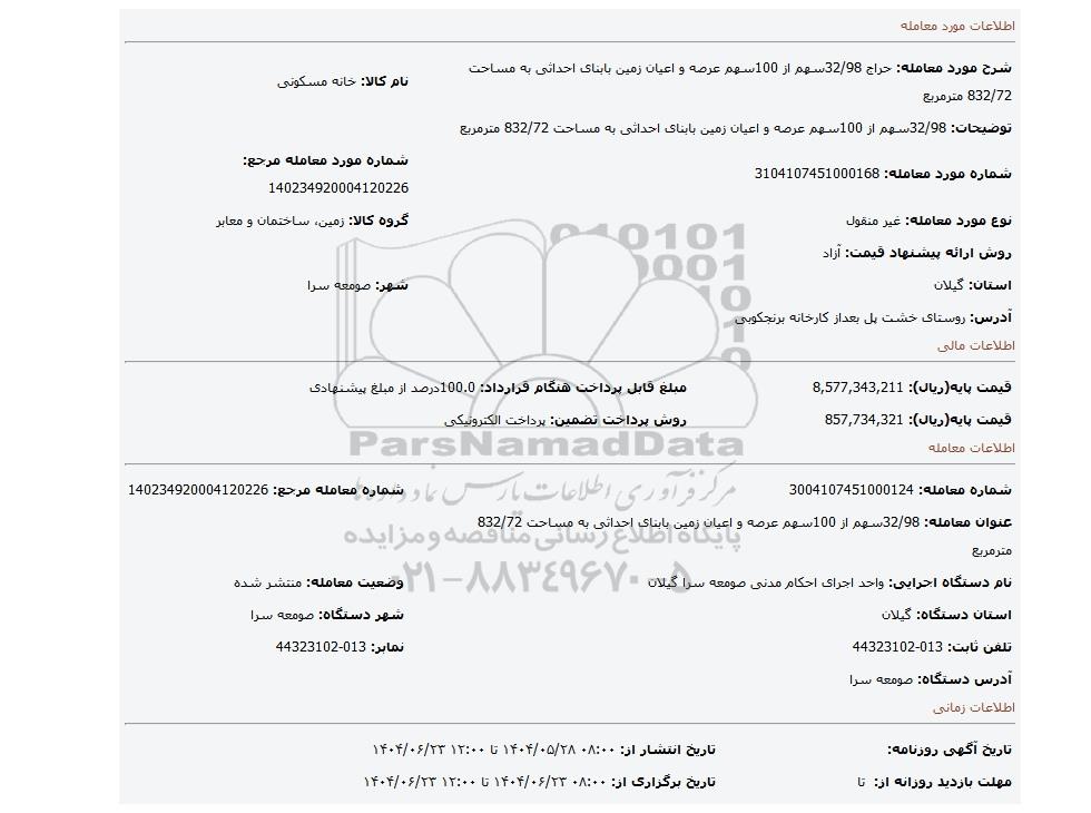 مزایده عمومی مزایده 32/98سهم از 100سهم عرصه و اعیان زمین بابنای احداثی به مساحت 832/72 مترمربع برگزار میگردد. از کلیه افراد متخصص و شرکت‌های واجد شرایط دعوت به عمل می‌آید تا در این مزایده با کد خبرگزاری پارس نماد : 9432036 شرکت نمایند تاریخ شروع مزایده : 1404/05/28 مهلت شرکت در مزایده: تا پایان روز 1404/06/23 مکان برگزاری اموال واگذاری استان‌های گیلان و دسته‌بندی‌های مربوط به این حراجی املاک و زمین میباشد. اطلاعات دقیق‌تر درباره شرایط شرکت در مزایده آنلاین و نحوه ارسال مدارک، الزامات پروژه و دریافت اسناد مزایده و تاریخ بازگشایی پاکت‌ها، در بخش اطلاعات تکمیلی این آگهی درج شده است.